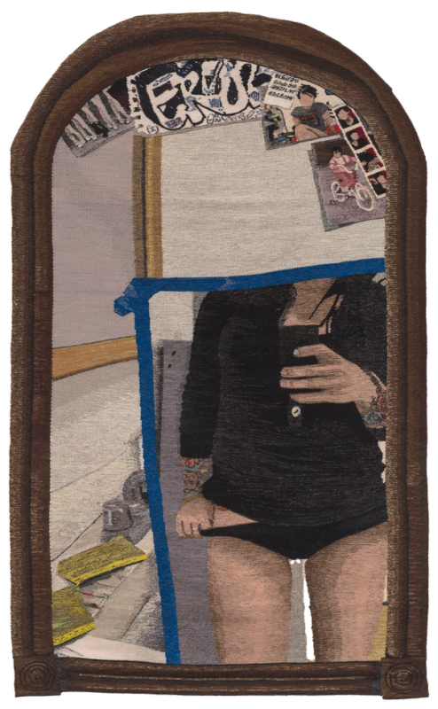 Erin M. Riley’s (b. 1985) meticulously crafted, large-scale tapestries depict intimate, erotic, and psychologically raw imagery that reflects upon relationships, memories, fantasies, sexual violence, and trauma. Collaging personal photographs, images sourced from the internet, newspaper clippings, and other ephemera to create her compositions, the Brooklyn-based weaver exposes the range of women’s lived experiences and how trauma weighs on the search for self-identity. In her review of Riley’s most recent solo exhibition with P·P·O·W, The Consensual Reality of Healing Fantasies, Roberta Smith of the New York Times wrote, “Her richly variegated colors and complex, arresting scenes take full advantage of tapestry’s stitch-by-stitch autonomy.”